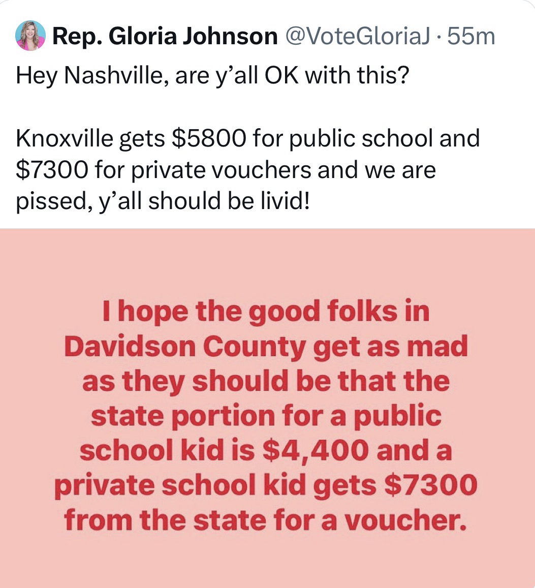 🤔 — @votegloriaj.bsky.social@bsky.brid.gy pointing out @GovBillLee’s voucher scam is spending a lot more on each private school kid than the state does on public school kids👇🏽