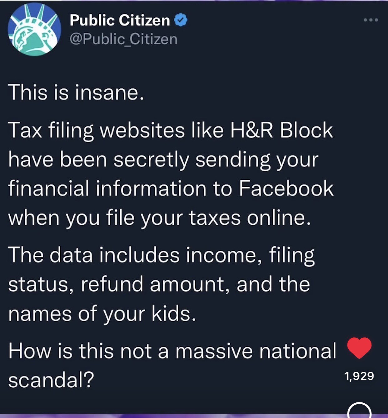 From Public Citizen: H&R Block has been sending your data to Facebook. #infosec