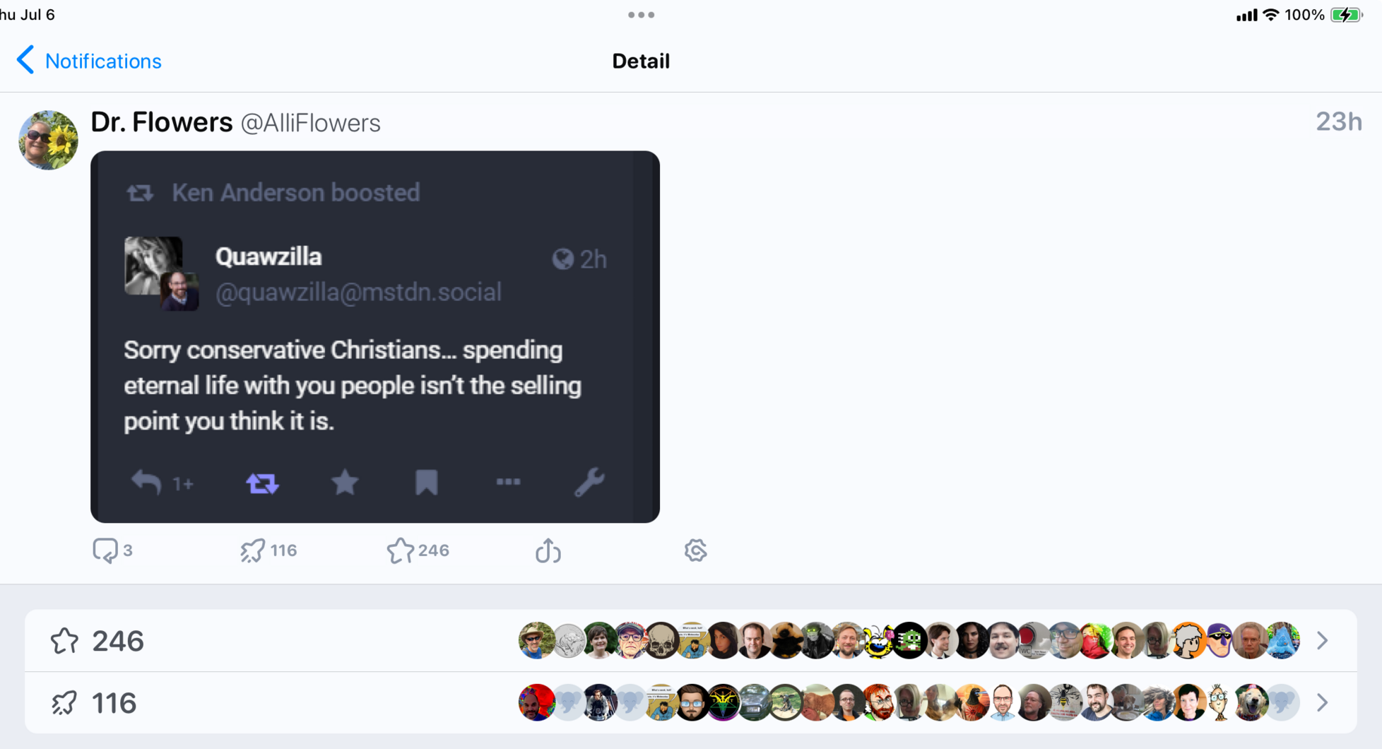 @quawzilla I feel I owe you an apology. Someone screen capped your comment and posted it. I loved it and boosted just the screen cap. You’ve gotten quite the love from it.