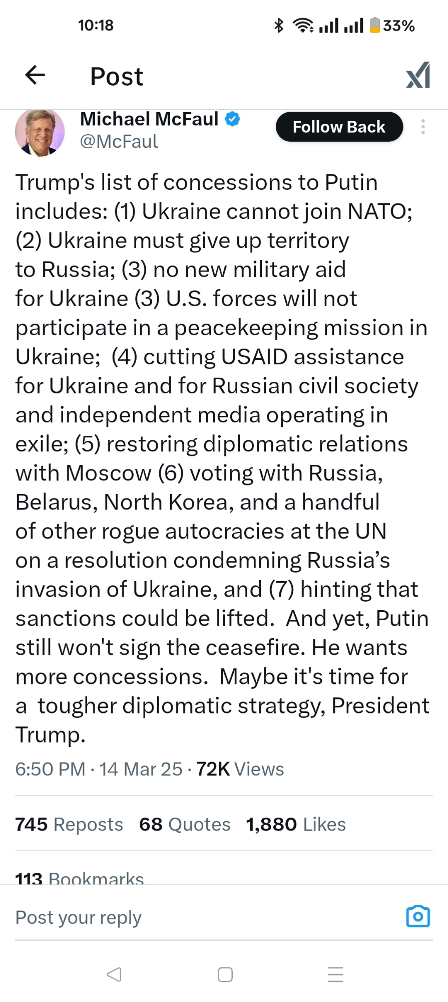 Many concessions have been made to Putin. Yet he still won't agree to a ceasefire. Read @mcfaulmike.bsky.social