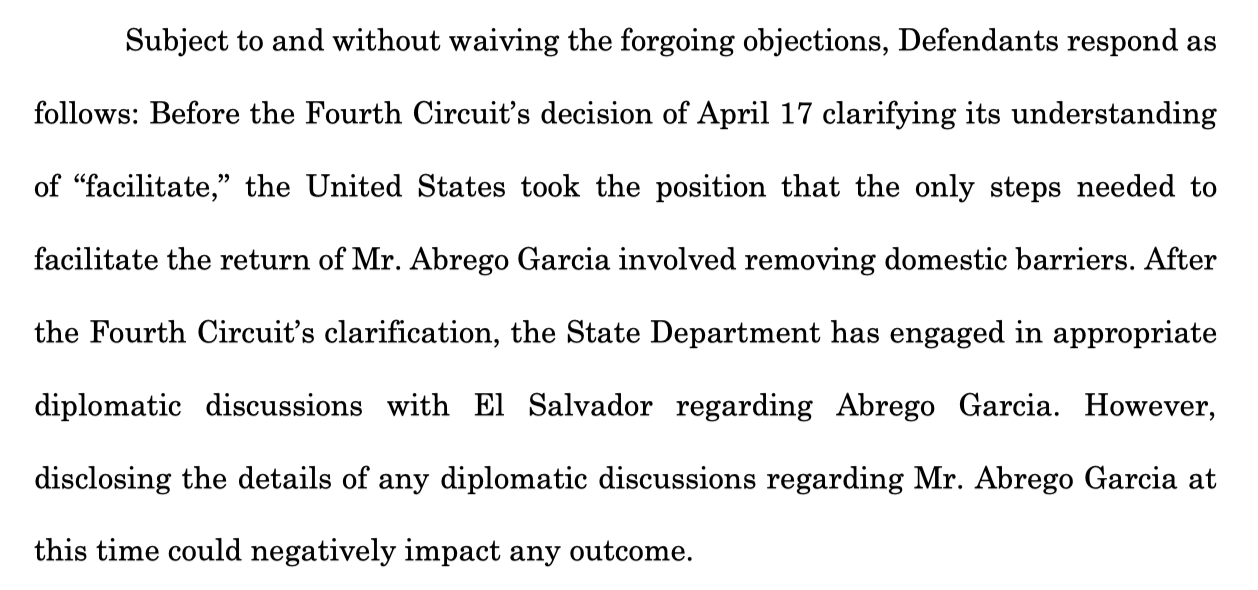 NEW: The govt claims that after the Fourth Circuit's powerful order in the Abrego Garcia case—which the govt describes as a "clarification"—the State Department "has engaged in appropriate diplomatic discussions with El Salvador regarding Abrego Garcia." But it refuses to say any more.