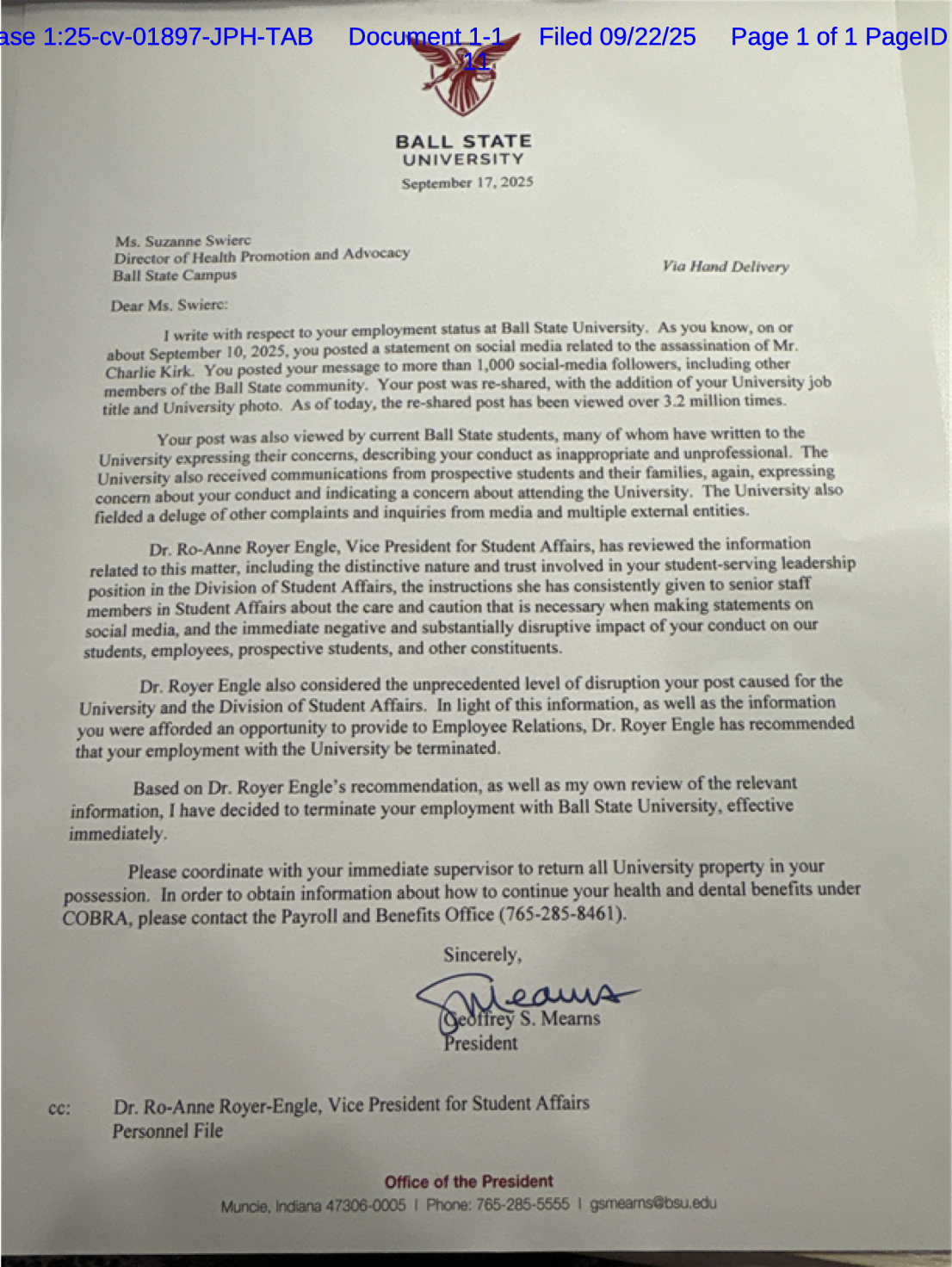 NEW: A former Ball State University staff member is suing the university president after she was fired for a private Facebook post about the death of Charlie Kirk. She is being represented by ACLU of Indiana @acluindiana.bsky.social. READ THE COMPLAINT: storage.courtlistener.com/recap/gov.us...