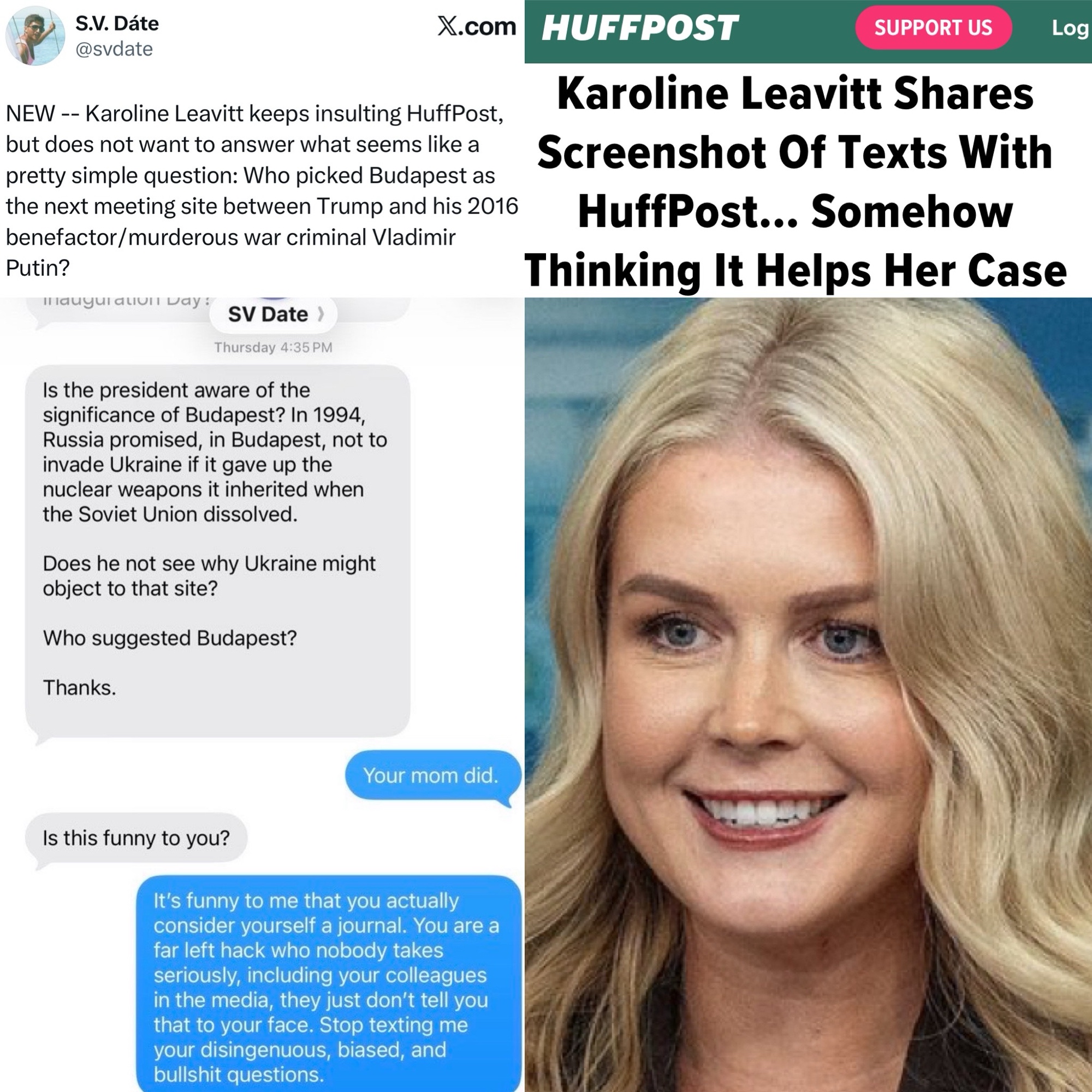 Trump’s Secretary of Lying shared the “your mom” text exchange — where she wouldn’t answer who picked Hungary as the site of the Putin-Trump meeting @svdate.bsky.social tried to explain the significance, which is almost definitely lost on her (and Trump)