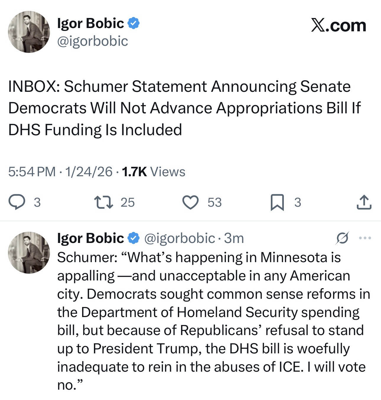 Andrew Solender of Axios reported on Saturday, "House Democrats are having an emergency virtual caucus meeting tomorrow at 11am ET on 'the Trump Administration's Lawless Actions in Minnesota' w/ Minnesota Gov. Tim Walz as a 'special guest,'