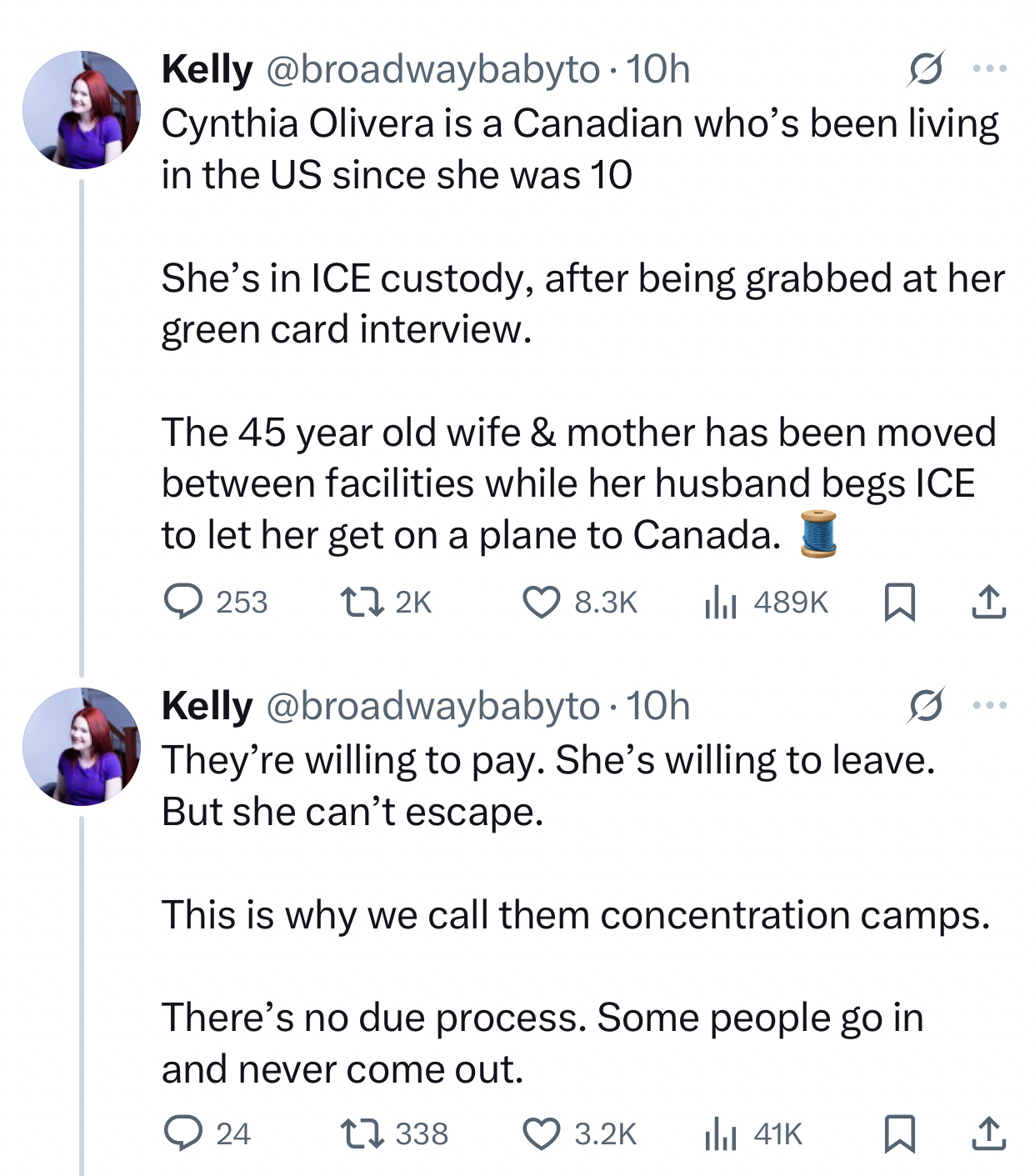 Reports that a Canadian citizen who has resided in the US since age 10 was abducted at a green card interview. Her husband is begging ICE to let him fly her back to Canada and they refuse to release her.