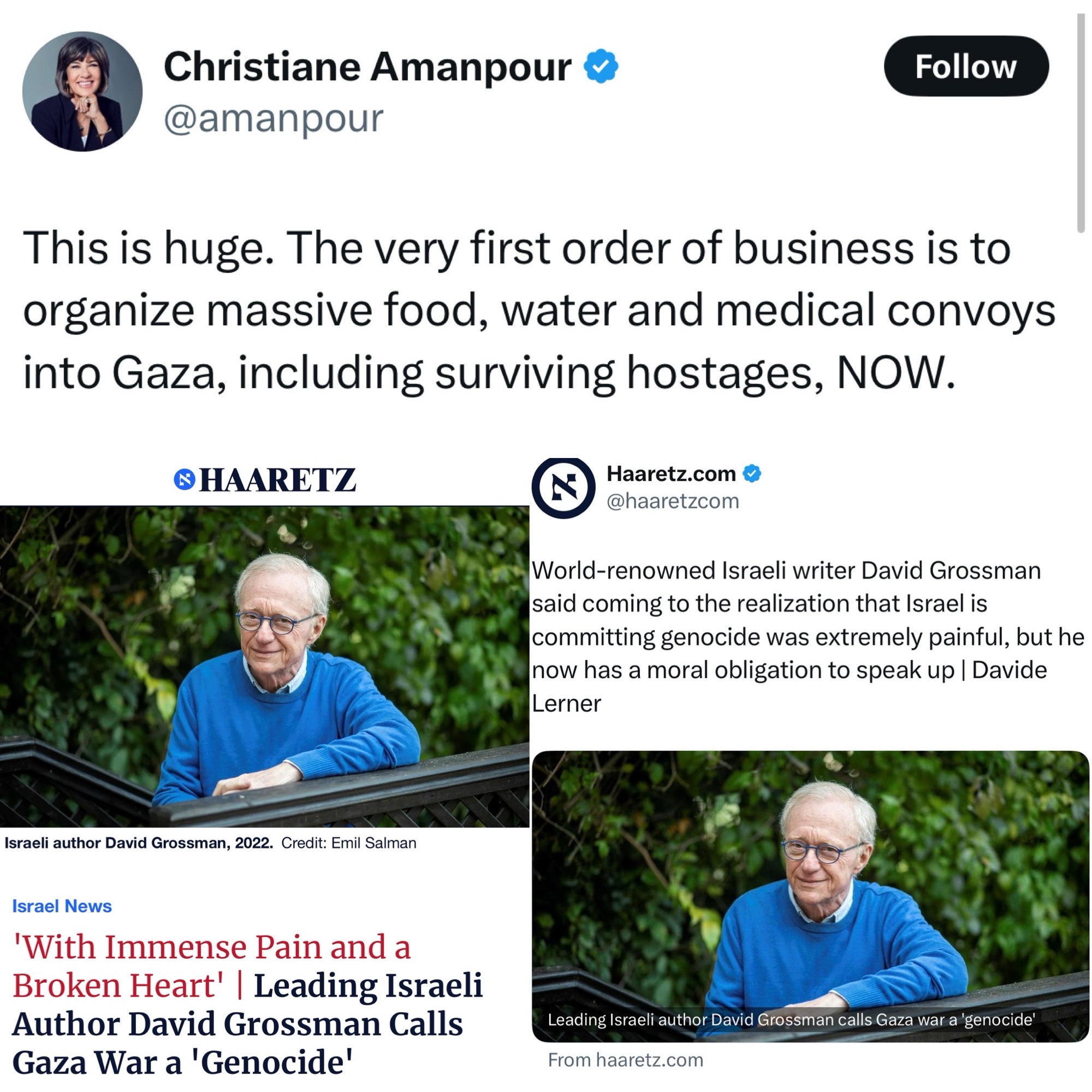 “World-renowned Israeli writer David Grossman said coming to the realization that Israel is committing genocide was extremely painful, but he now has a moral obligation to speak up.” www.haaretz.com/israel-news/...