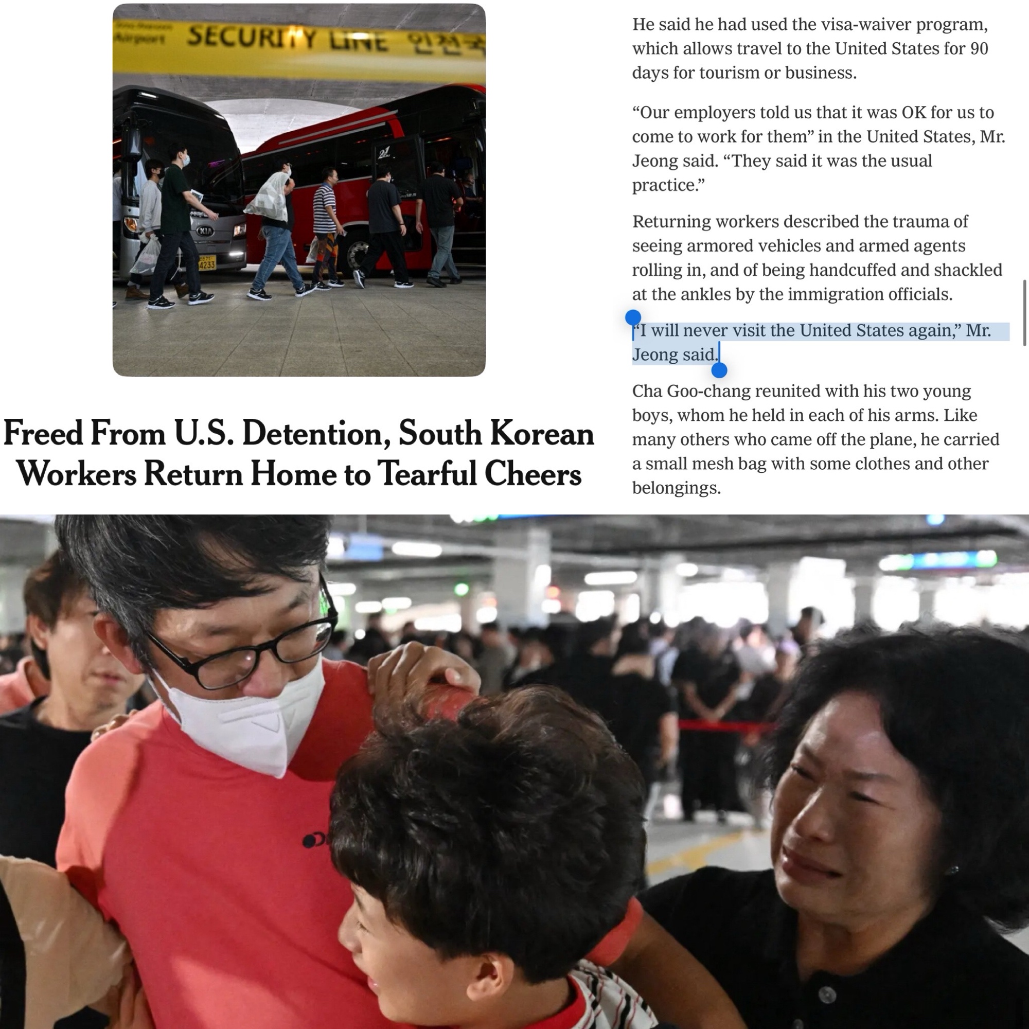 “Our employers told us it was ok… I will never visit 🇺🇸 again. It feels good to be free.” Hundreds of South Korean workers detained in shackles landed home, met by family who tearfully hugged them. Arrested building a factory to employ thousands. www.nytimes.com/2025/09/12/w...