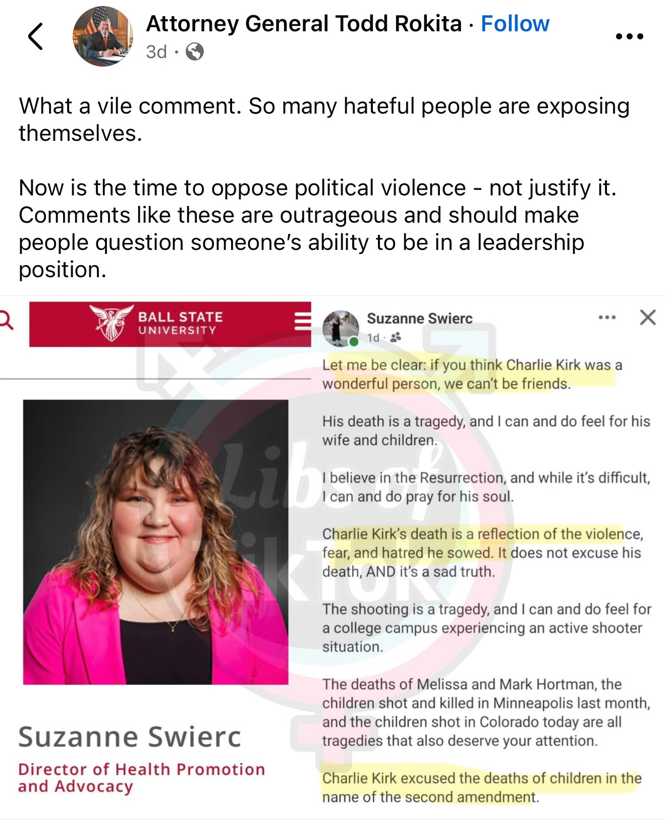 NEW: A former Ball State University staff member is suing the university president after she was fired for a private Facebook post about the death of Charlie Kirk. She is being represented by ACLU of Indiana @acluindiana.bsky.social. READ THE COMPLAINT: storage.courtlistener.com/recap/gov.us...